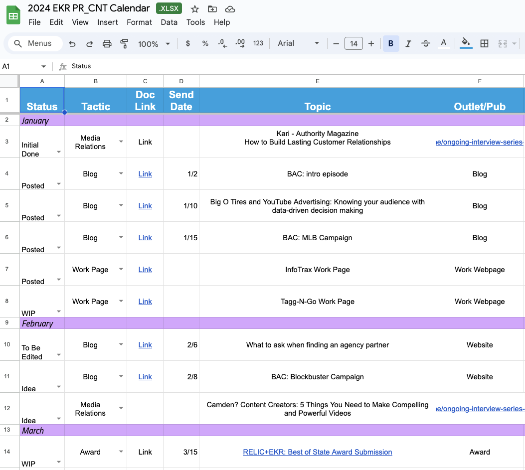 Within the almost 6 years I worked for Relic+EKR, I continued to build and grow our PR/Content Calendar. This was baked into every client’s package because it was a one-stop place for all PR/CNT services the client did and my team executed on. Over the years it grew from on sheet to anywhere from 3-6 depending on various offerings and budget size. This list is a small sampling of inclusions.