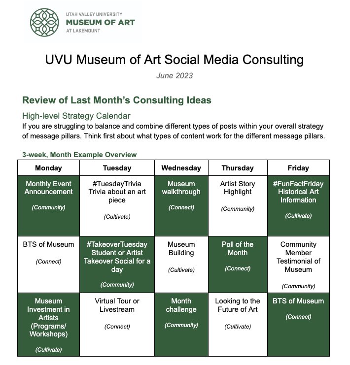 When I started, consulting was just writing a few captions for the month. I initiated a robust consulting report to teach clients about social media more fully from algorithms to sizing formats and my favorite part was posting strategies based on brand personality and message pillars.